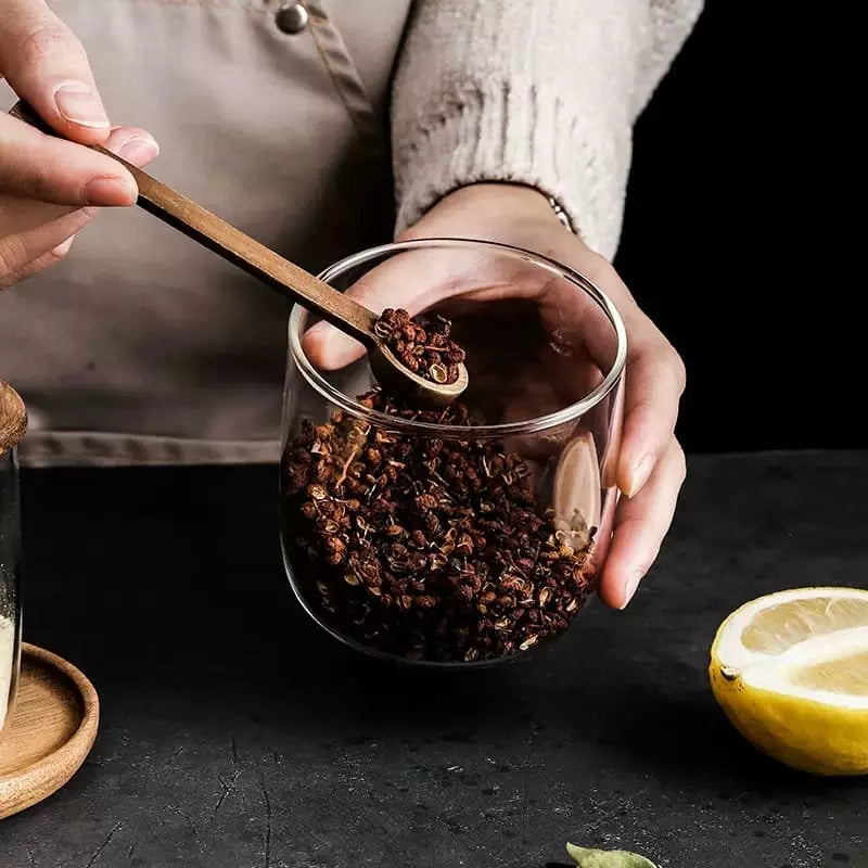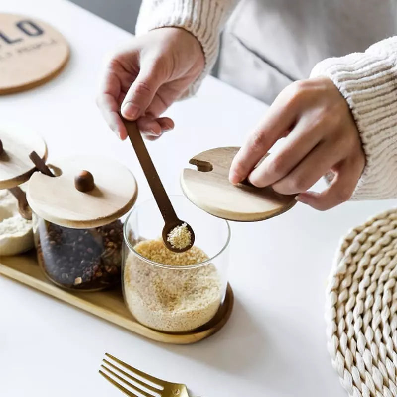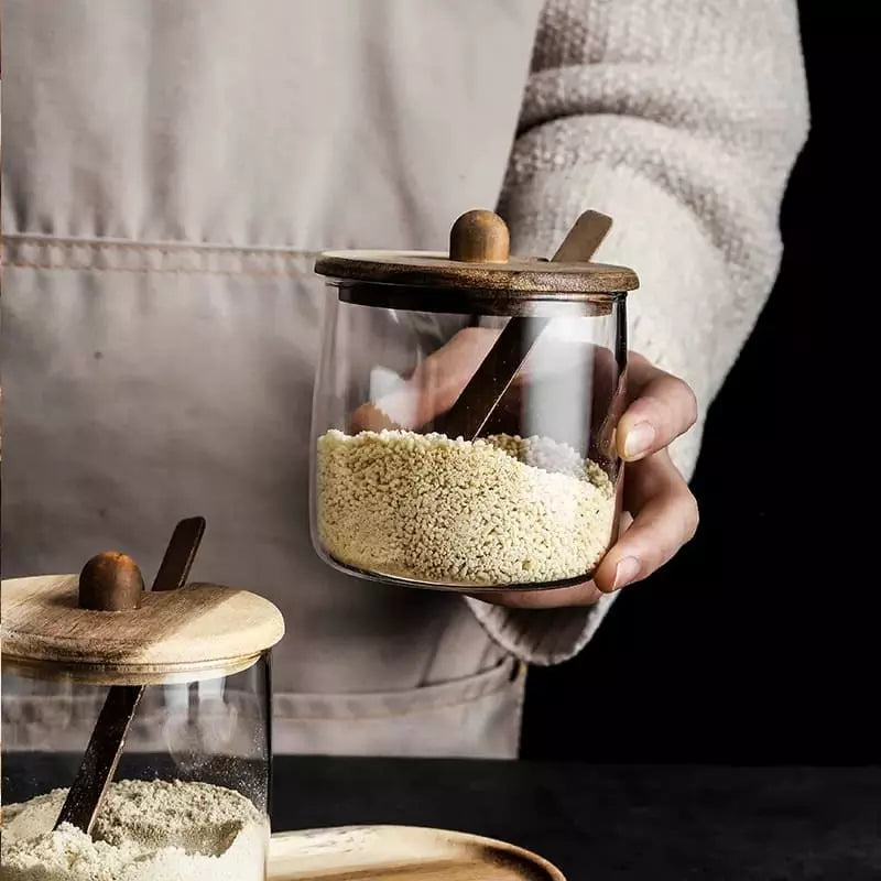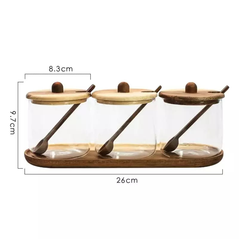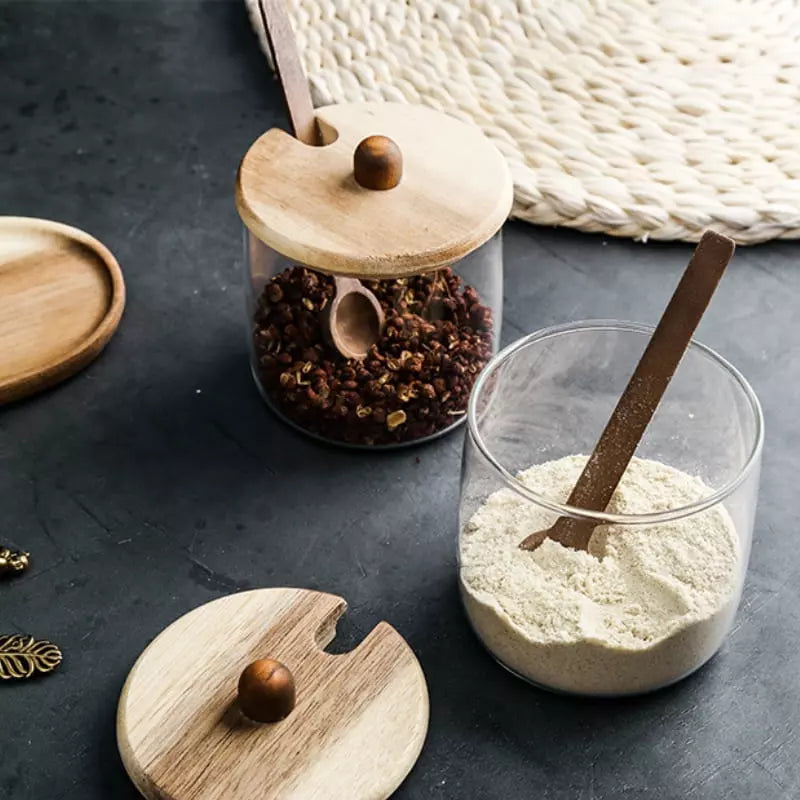 Conjunto de Potes de Vidro com Tampa de Madeira e Colher